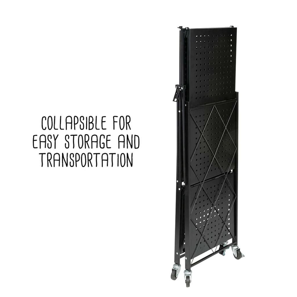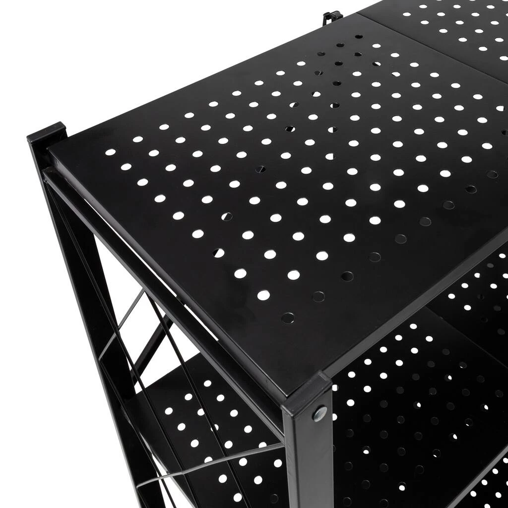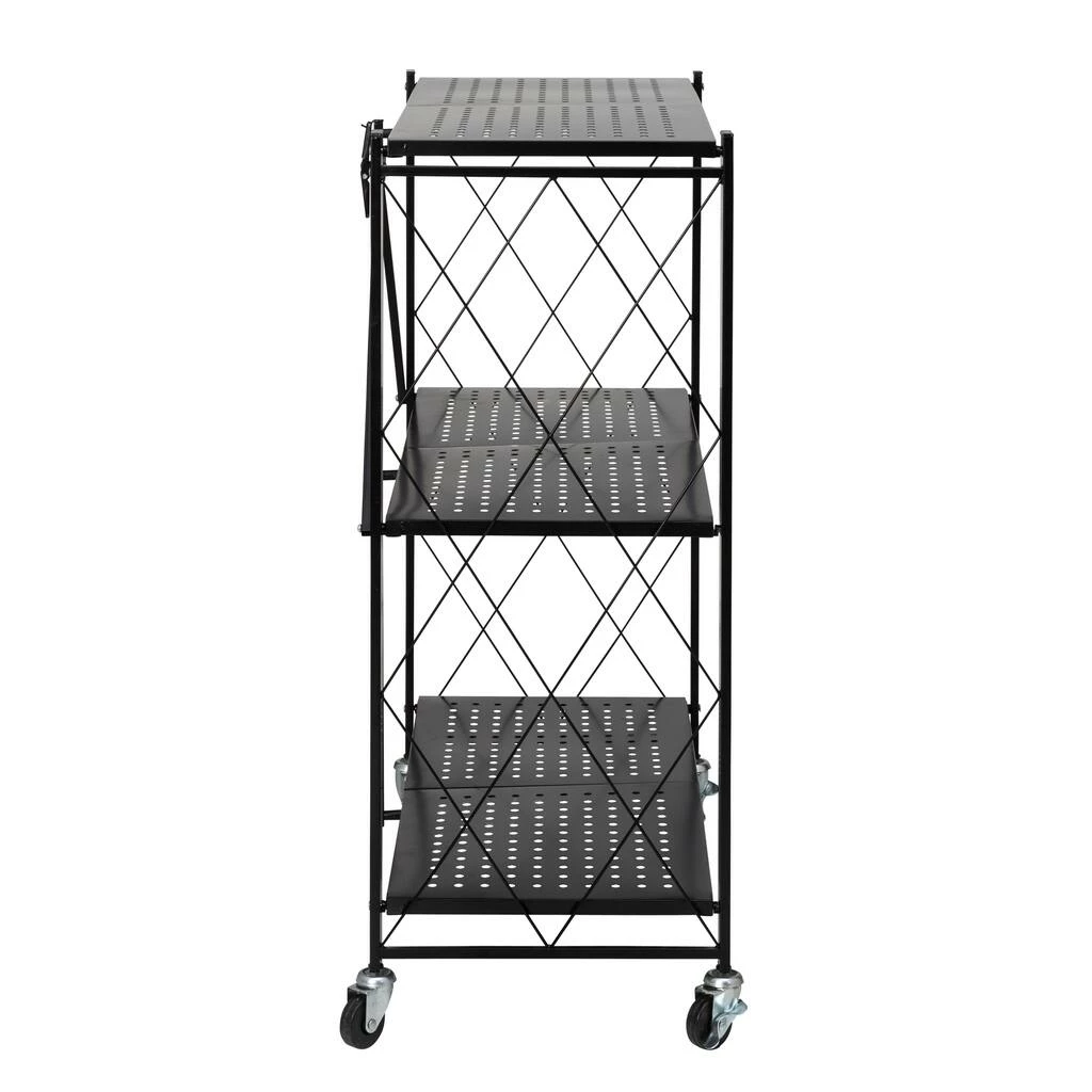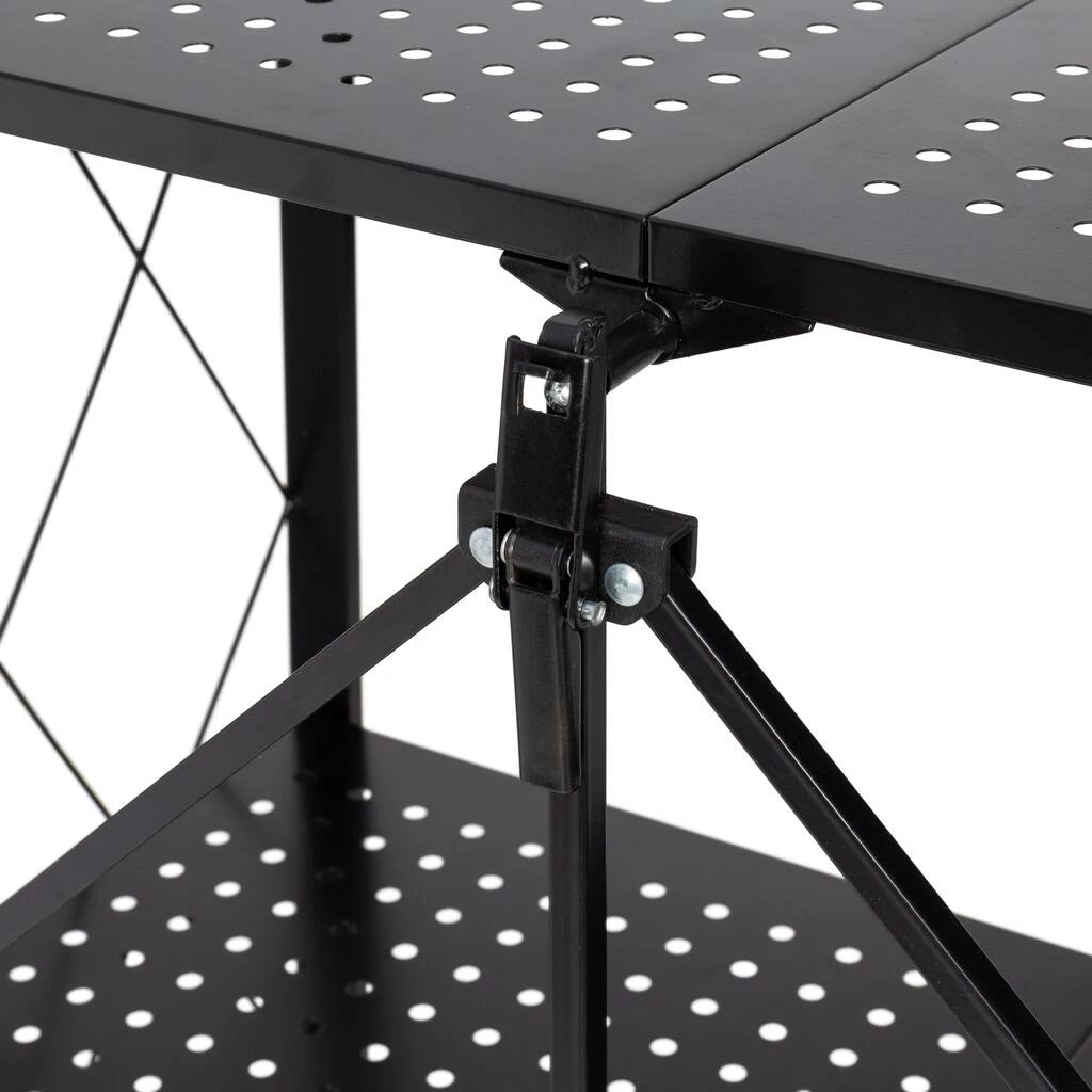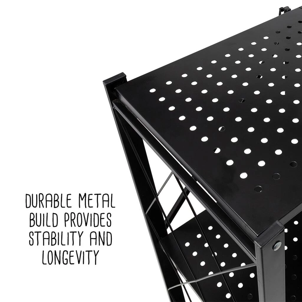 When you unfold this shelf on wheels, you are opening a world of possibilities! Its four casters make it a breeze to move around, while its three tiers of shelves provide ample storage space – perfect for plants, cooling baked goods, or as a pop-up bar for parties. Looking for a portable shelf for craft fairs or market booths? With its durable metal build, black finish, geometric wire detailing, and collapsible design, this is a home run. The black metal shelves won’t be bothered by the sun or rain. Plus, the open geometric sides allow items to be viewed from all angles, so customers won’t miss a thing.