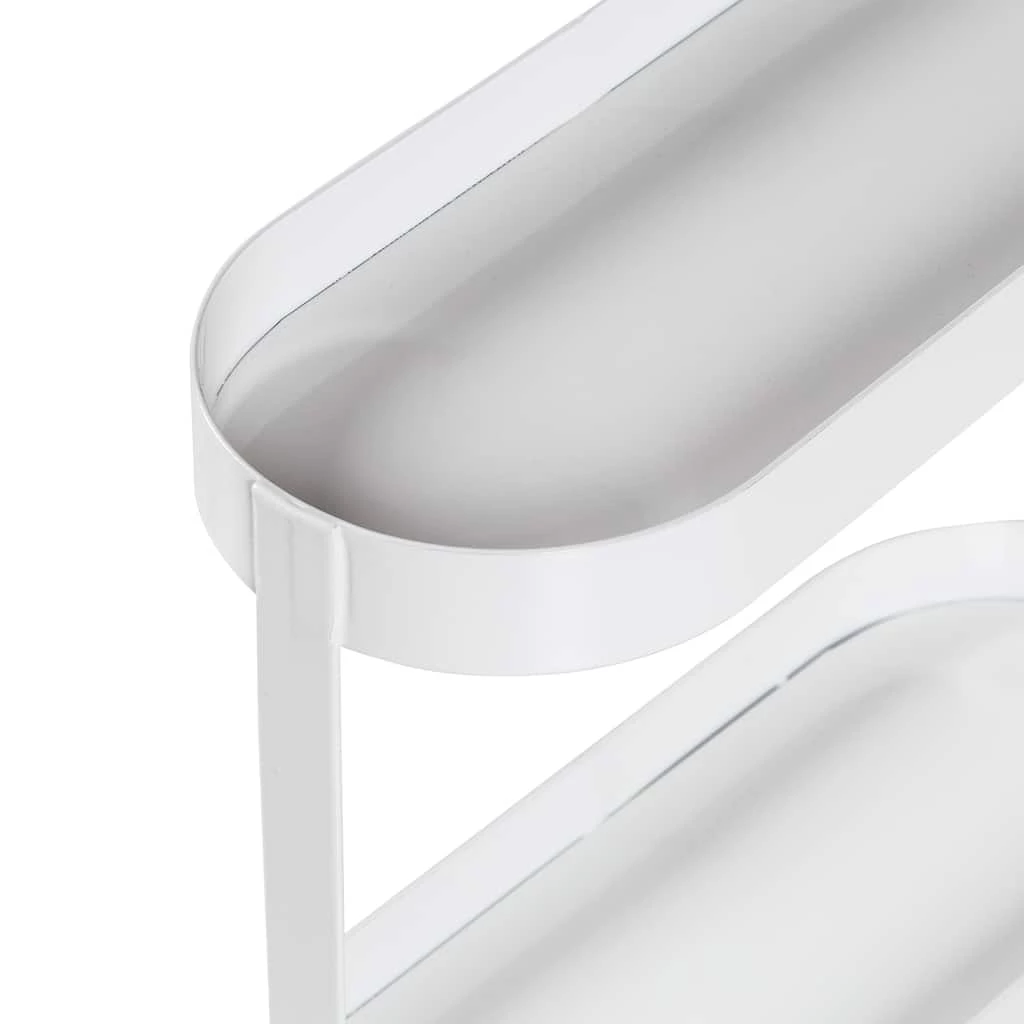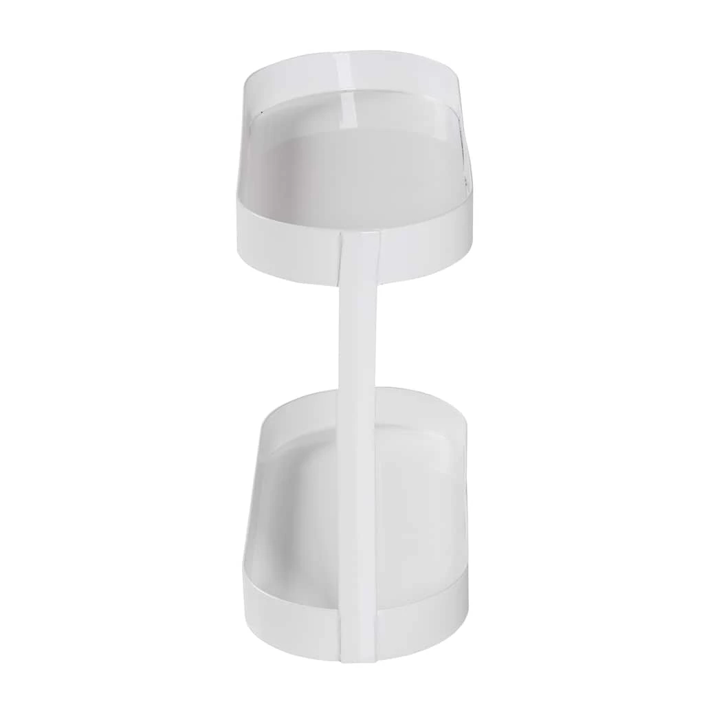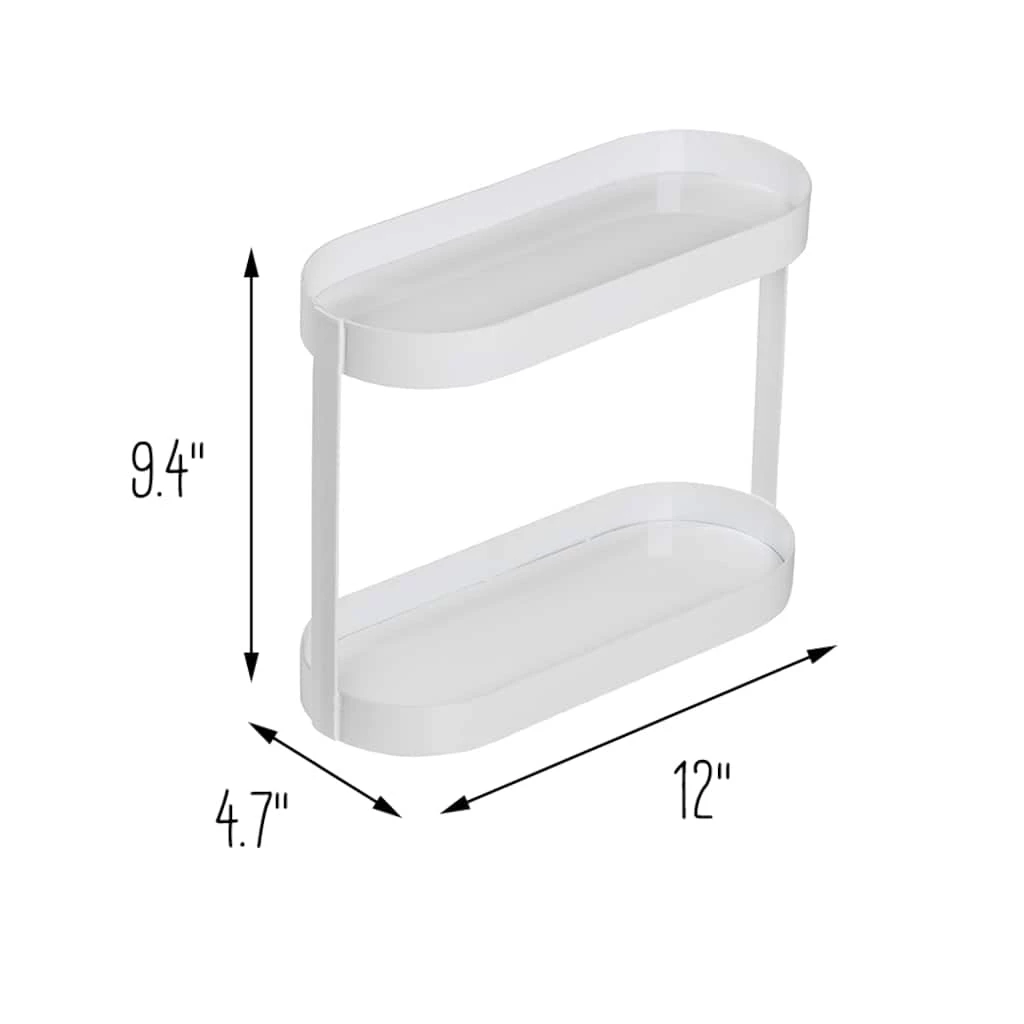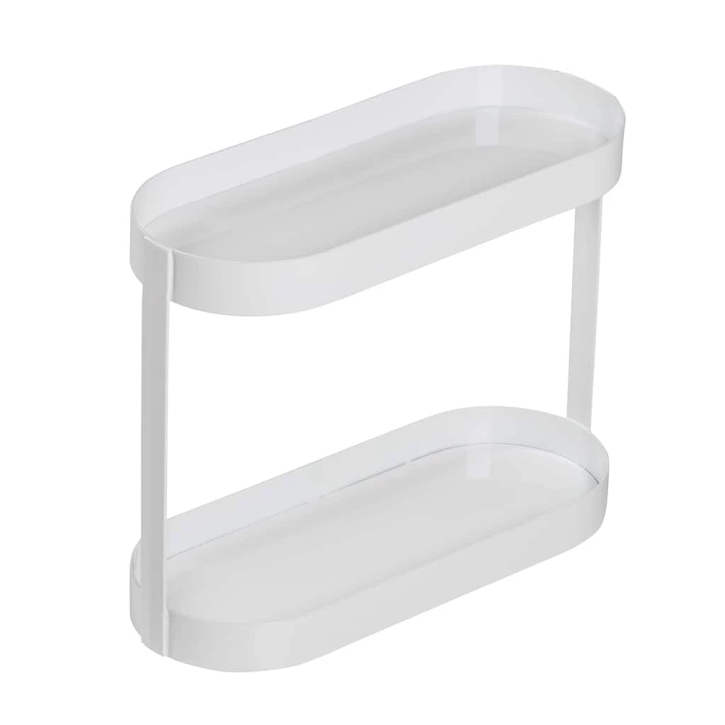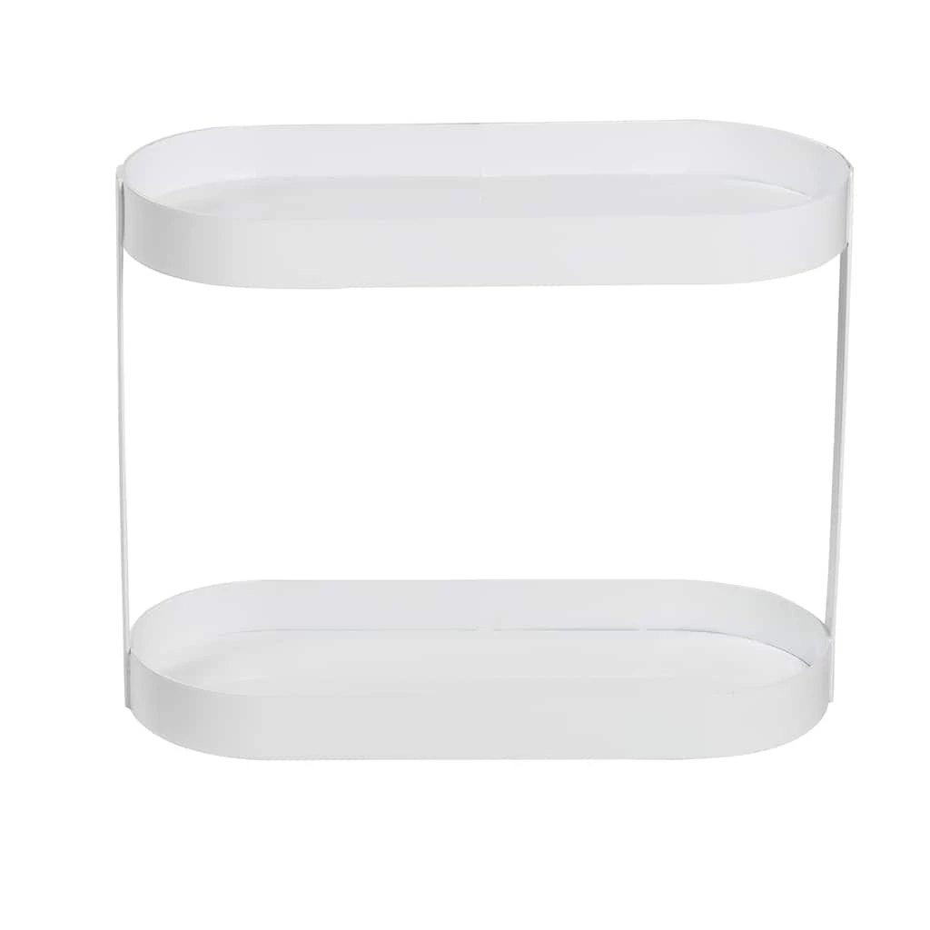 Make messy countertops a thing of the past while keeping your everyday bathroom necessities easily accessible. This counter organizer shelf features a sleek white metal build with two tiers of oval trays to keep toiletries and makeup organized and corralled. The top shelf is the perfect size to slide in a toothbrush holder, soap pump, or a handful of hair products, while the bottom tray is ideal for smaller items like lipsticks, serums, razors, and jewelry. The simple design and crisp white finish make this the perfect bath shelf for any home that craves organization and wants to reclaim its counter space.