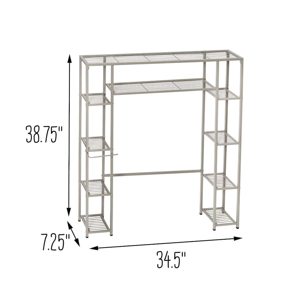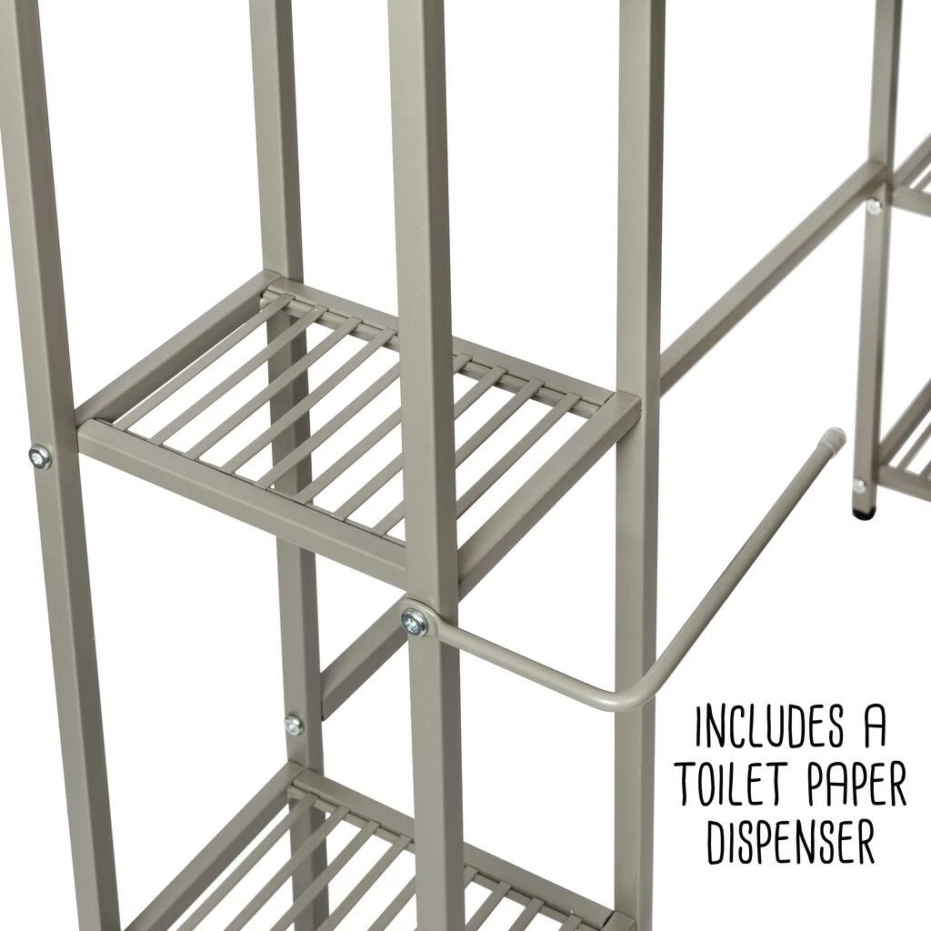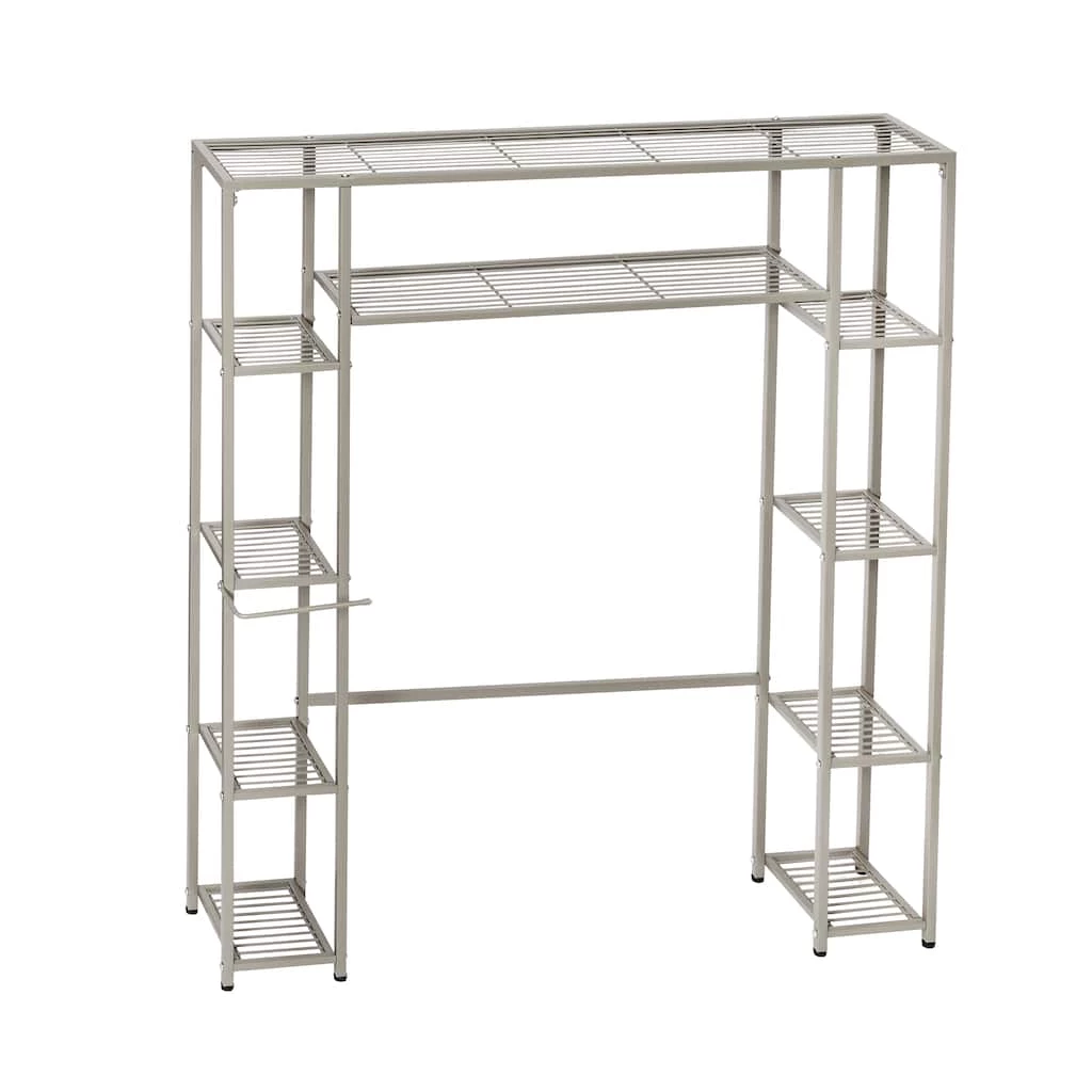 While we love organization that is versatile, there is something great about solutions that are super specific. For example, this over-the-toilet steel storage shelf. Itβs especially designed to maximize an oft-overlooked space in a room thatβs very typically lacking for storage. Many powder rooms and plenty of master baths just arenβt equipped with the cabinetry or closet space most homes need. This shelving unit flanks a commode with two columns of four slatted shelves, plus an overhead slatted shelf that runs the length of the unit. Keep bins of lotions or baskets of towels on hand, while still having cozy shelf free for a handmade candle or fleshy succulent.