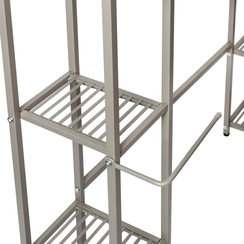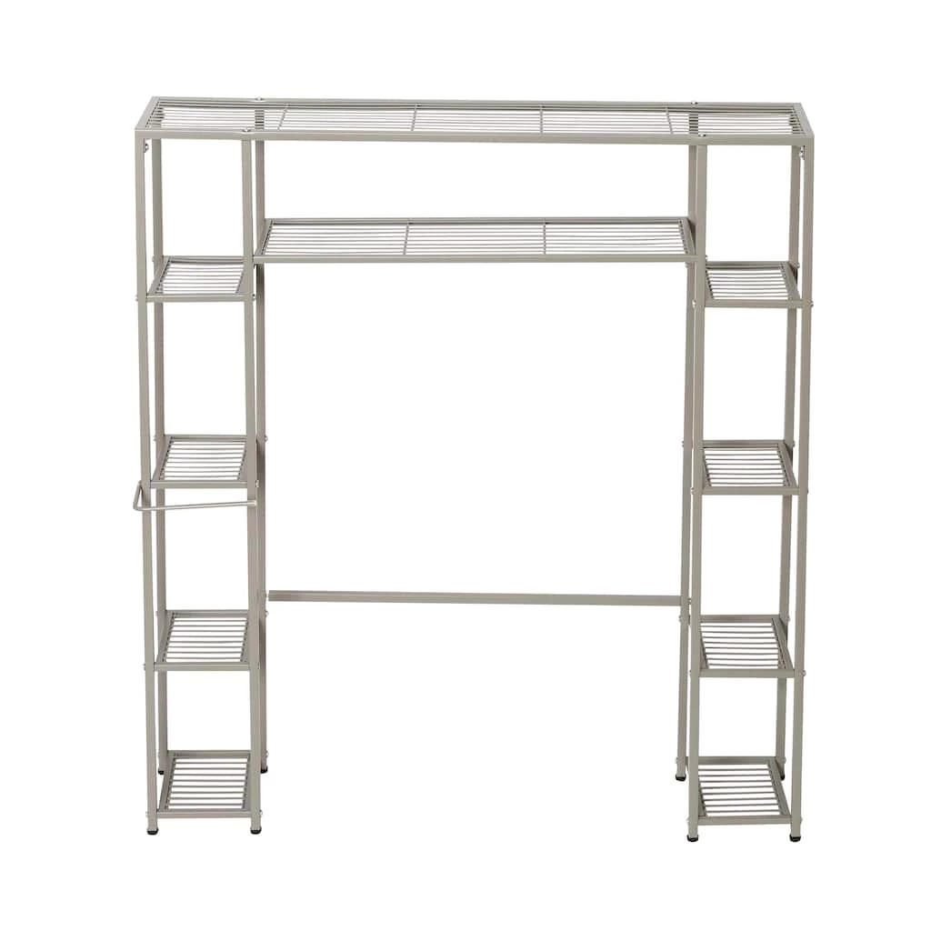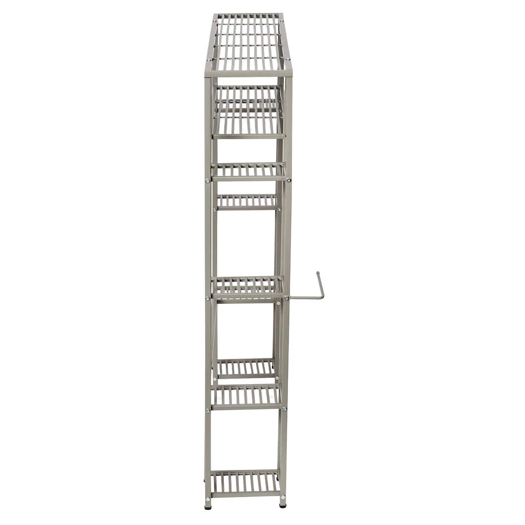 While we love organization that is versatile, there is something great about solutions that are super specific. For example, this over-the-toilet steel storage shelf. Itβs especially designed to maximize an oft-overlooked space in a room thatβs very typically lacking for storage. Many powder rooms and plenty of master baths just arenβt equipped with the cabinetry or closet space most homes need. This shelving unit flanks a commode with two columns of four slatted shelves, plus an overhead slatted shelf that runs the length of the unit. Keep bins of lotions or baskets of towels on hand, while still having cozy shelf free for a handmade candle or fleshy succulent.