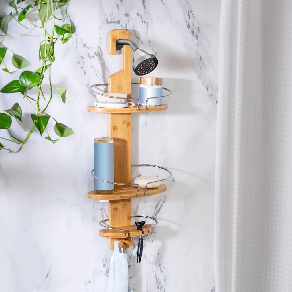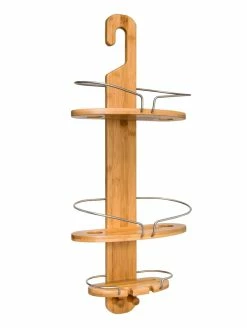 Just like a caddy elevates a golferβs performance, this bamboo hanging shower caddy brings out the best in any shower game. With three shelves, cut-outs for razors, and catches for clothes, this caddy keeps everything you might need right where youβll need it. One of our favorite features is a pair of circular cut-outs on each of the top two shelves, where shampoos, lotions, or other cleansers can hang upside down to easily and efficiently dispense till the last drop. Since itβs made from bamboo β which thrives in the heat and humidity central to all-star showers β you can plan for this shower caddy to stay at your side for many more rounds of showers to come.