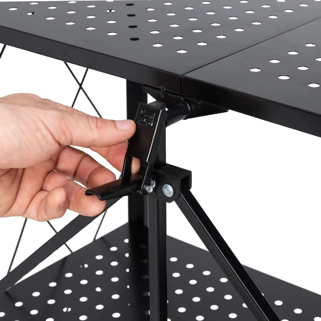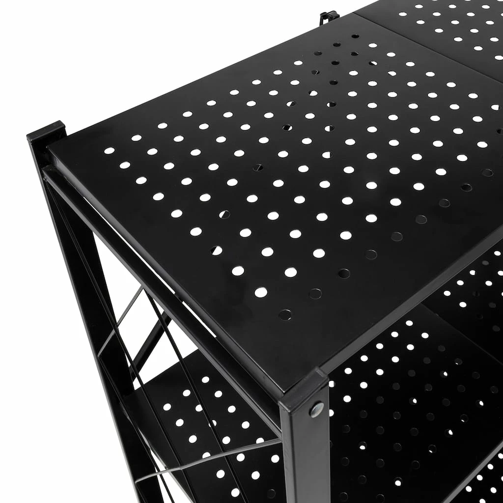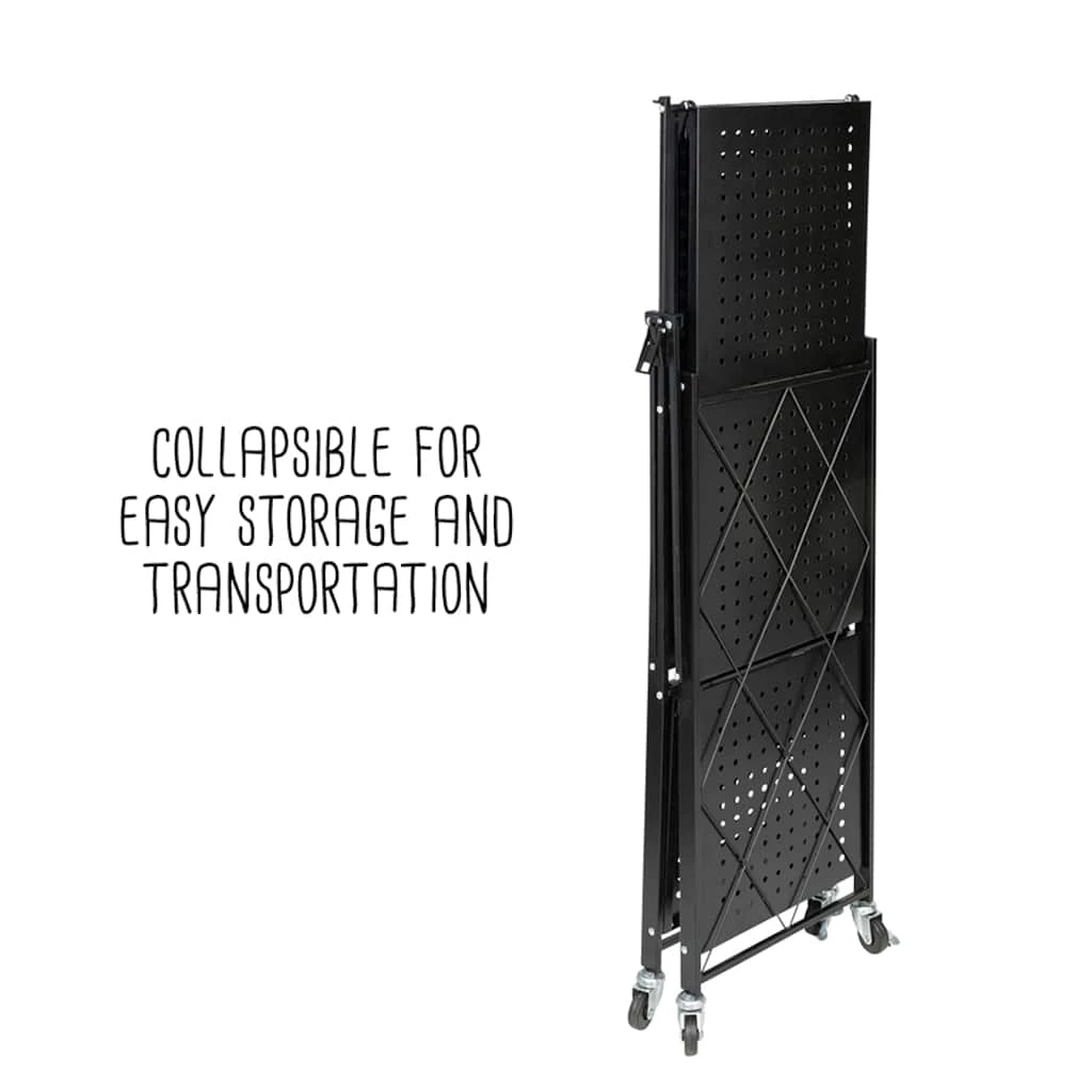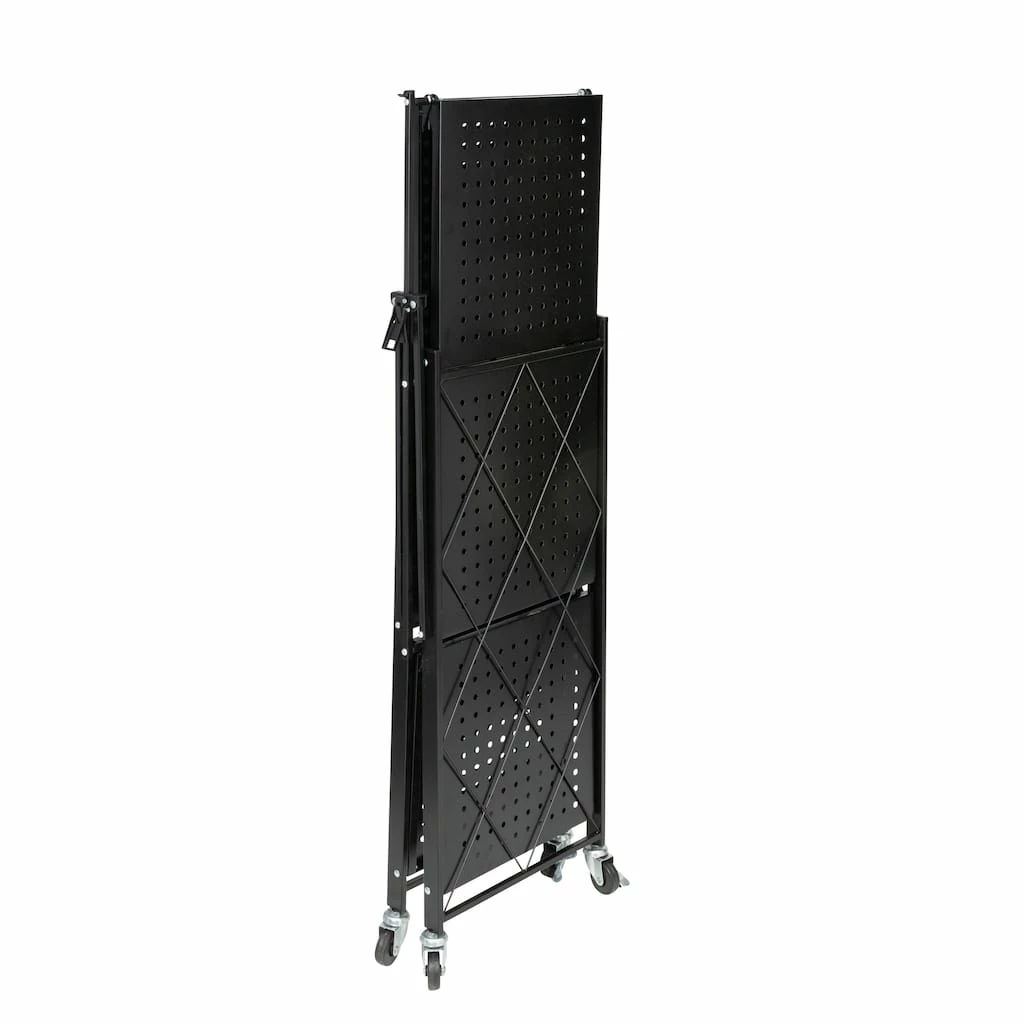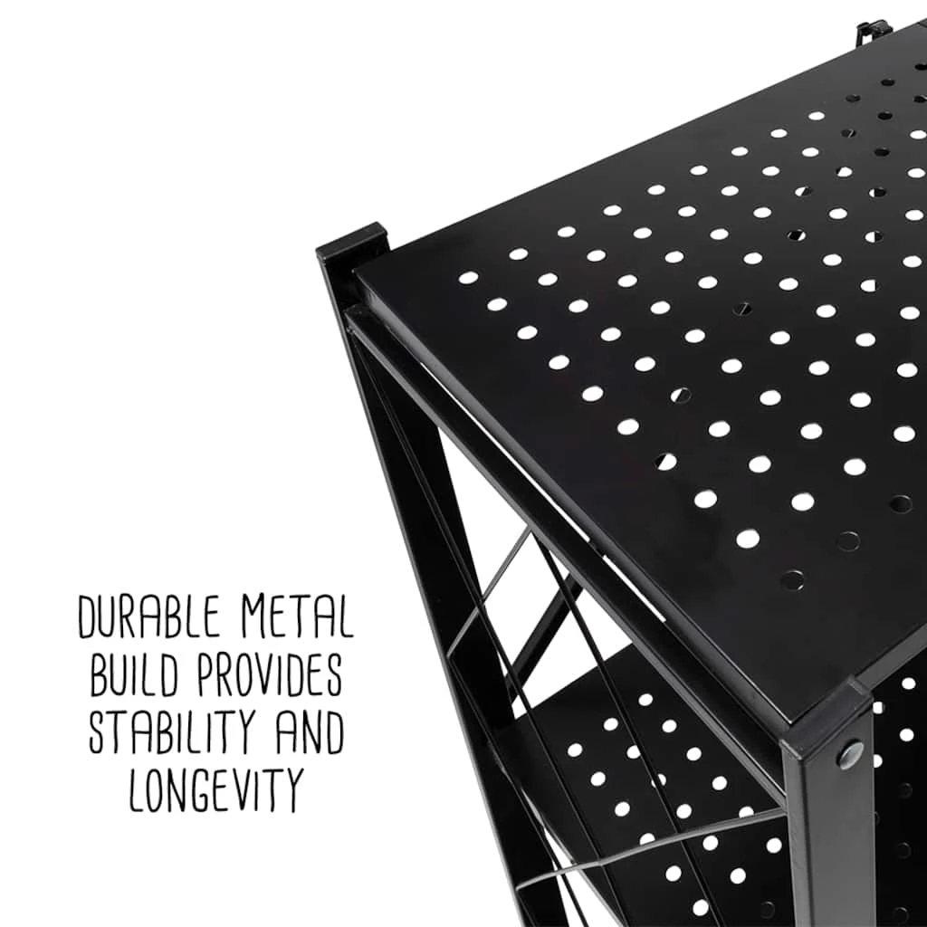 When you unfold this shelf on wheels, you are opening a world of possibilities! Its four casters make it a breeze to move around, while its three tiers of shelves provide ample storage space β perfect for plants, cooling baked goods, or as a pop-up bar for parties. Looking for a portable shelf for craft fairs or market booths? With its durable metal build, black finish, geometric wire detailing, and collapsible design, this is a home run. The black metal shelves won’t be bothered by the sun or rain. Plus, the open geometric sides allow items to be viewed from all angles, so customers won’t miss a thing.