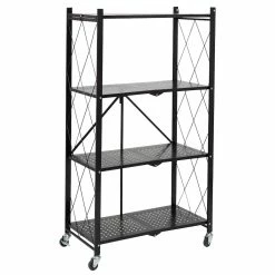 Sturdy and foldable, this collapsible shelf is overflowing with possibilities. Once you unfold this black beauty, its four caster wheels make it a breeze to move around. At the same time, its four tiers of shelves provide ample storage space β perfect for craft fairs, cooling baked goods, or as a pop-up bar for parties. Looking for a folding plant stand? With its durable metal build, black finish, and geometric wire detailing, your plants will feel right at home on this shelf on wheels. The perforated metal shelves allow plenty of airflow and won’t warp with moisture. Plus, the open wire geometric sides allow light to nourish your plants from all angles.