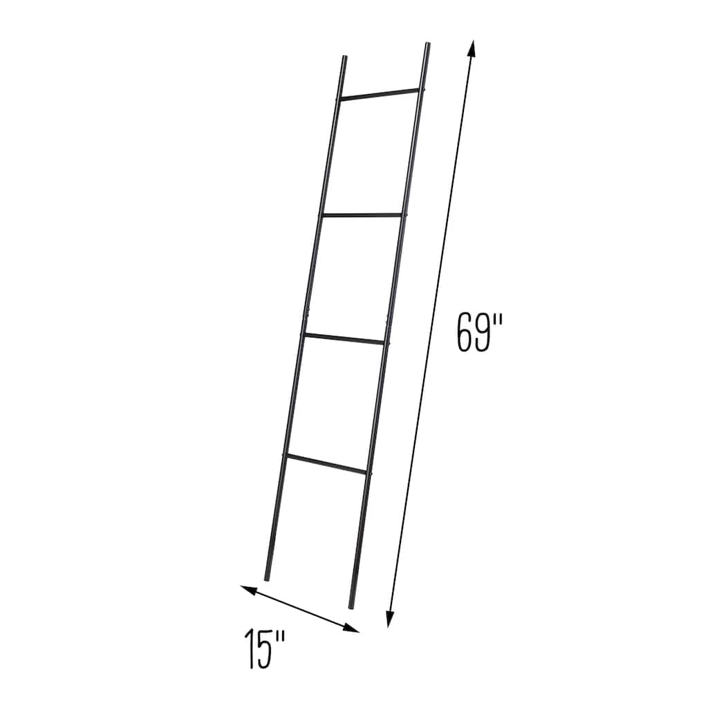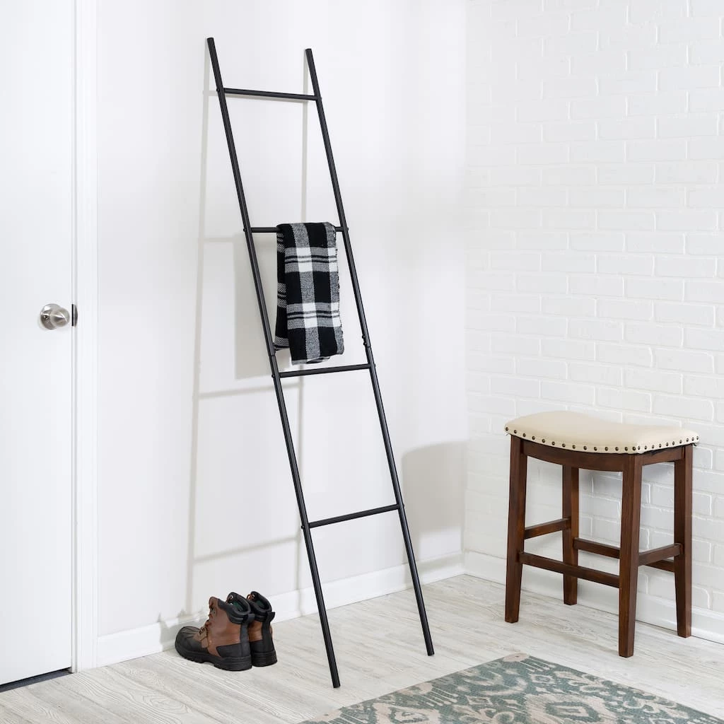 This ladder rack leans cleanly and is a welcome design and storage addition to any room. Keep throw blankets, towels or clothing accessories close while giving your space a fashionable decor accessory of its own. Clean, symmetrical lines on this open-air sleek black steel frame provide a simple, yet sophisticated look to your space.