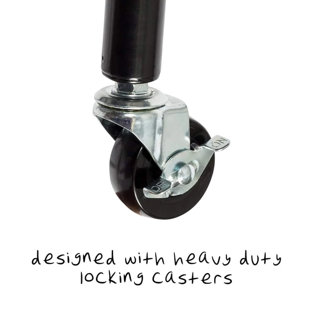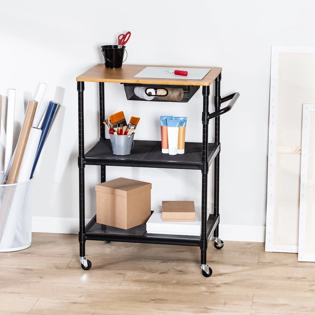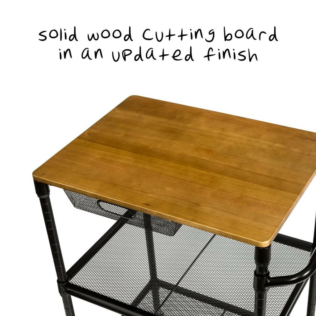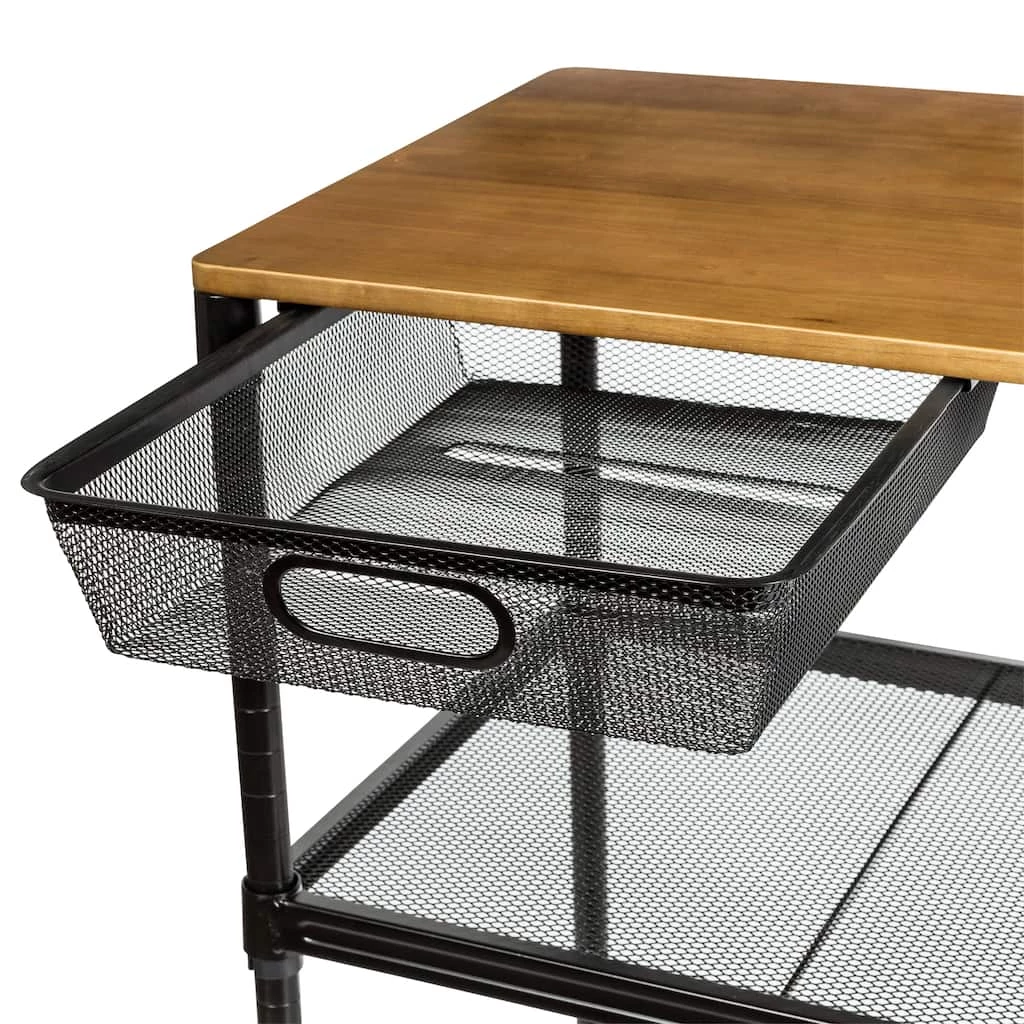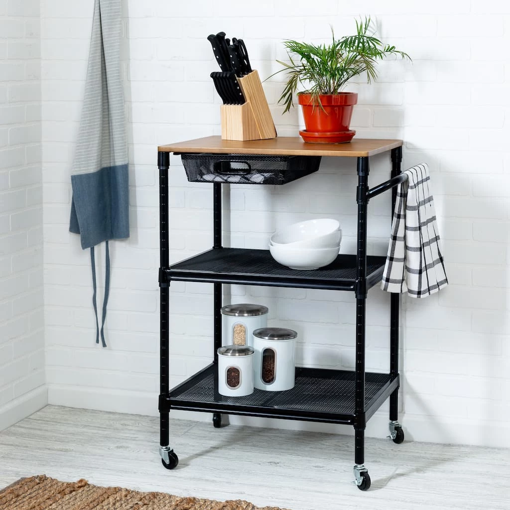 This rolling kitchen storage cart does it all. Saturday night itβs your bar cart, rolling from room to room serving guests. And when you wake up Sunday it goes back to being your cutting board when your kitchen island runs out of room. Hang towels from its adjustable bar and easily access kitchen tools from its pull-out basket. Additional storage can be found in its two bottom shelves. Go ahead, roll it around and smile.