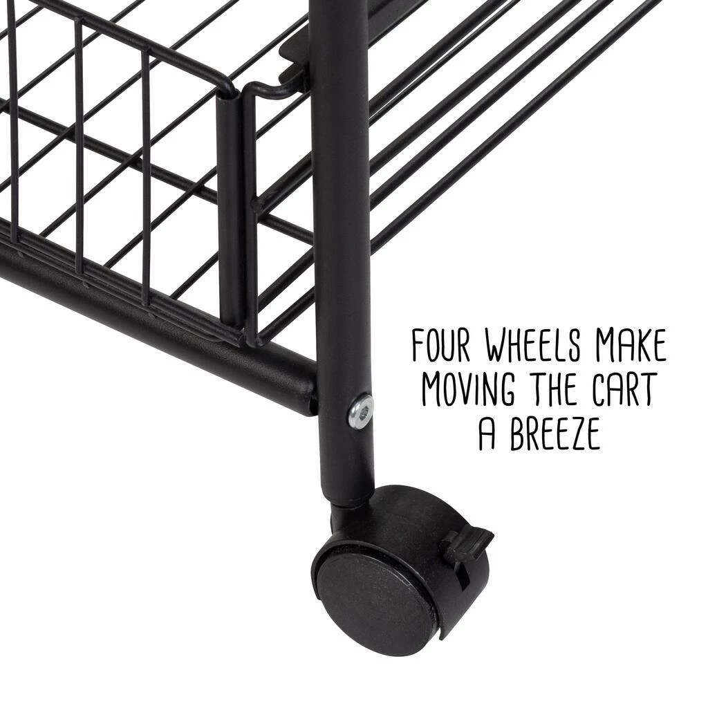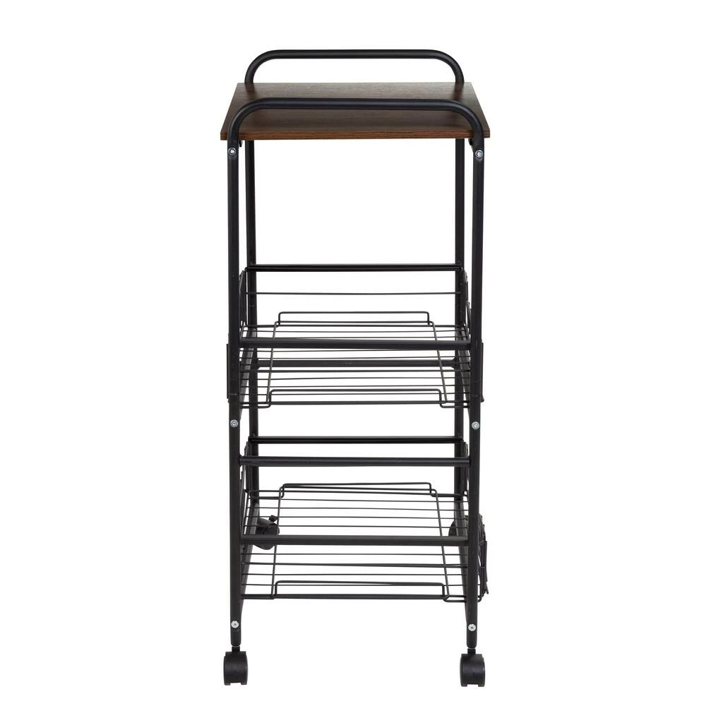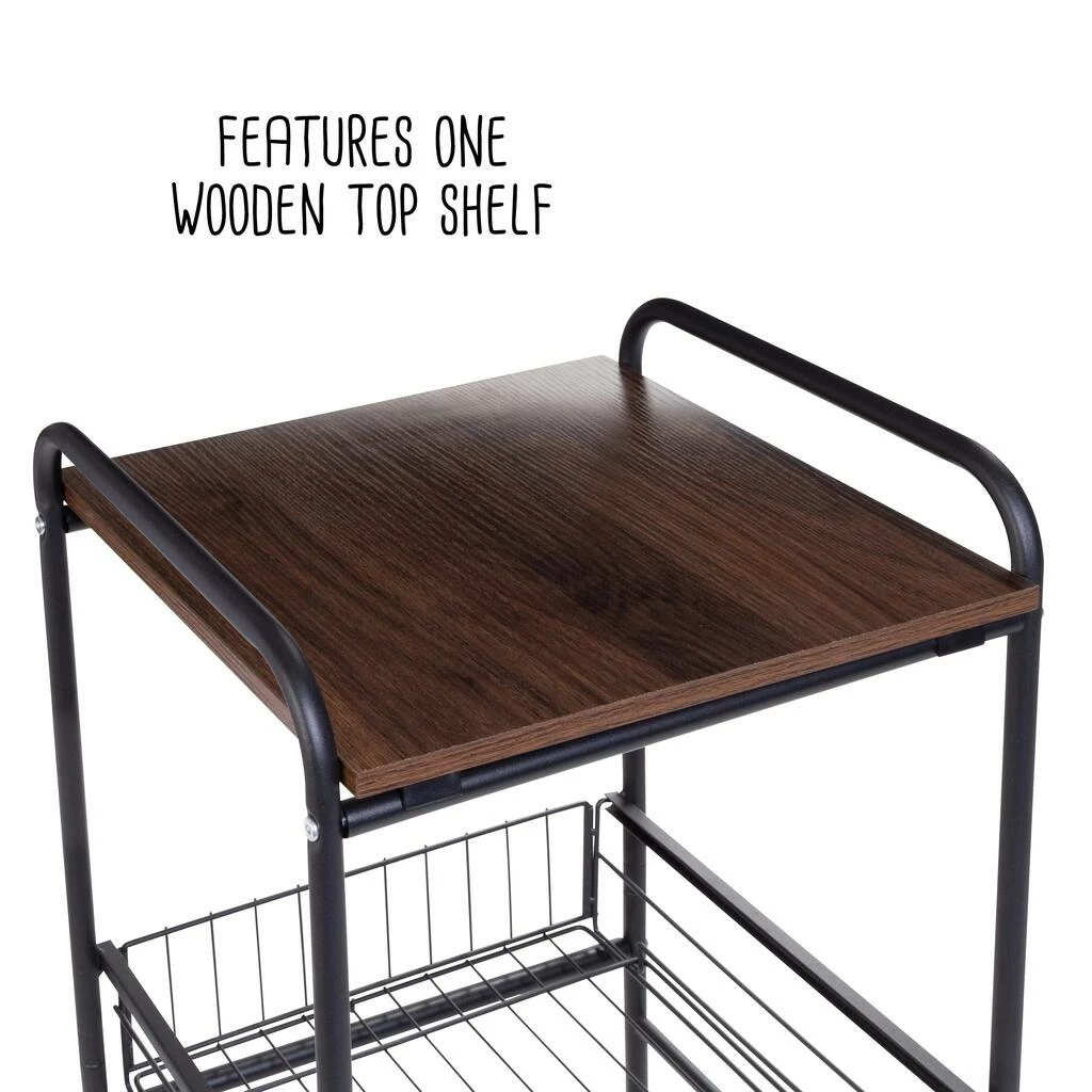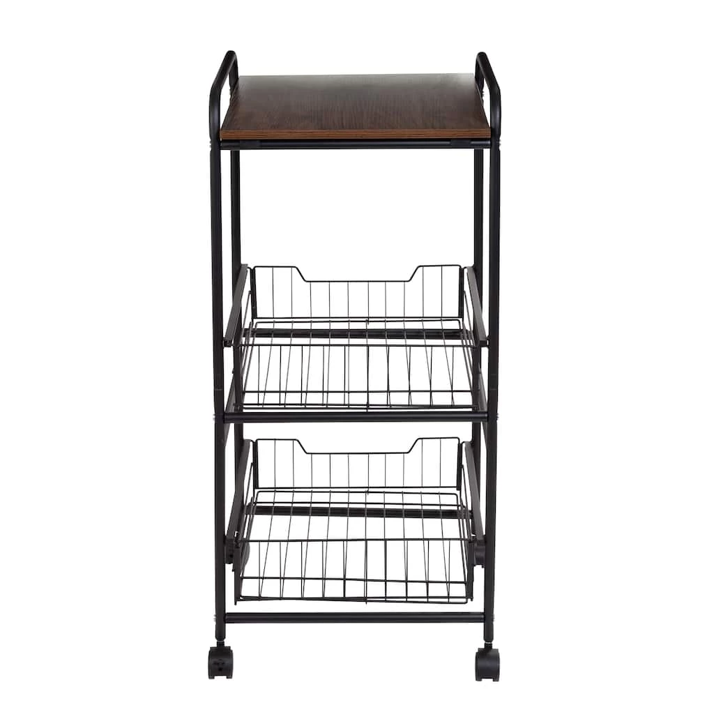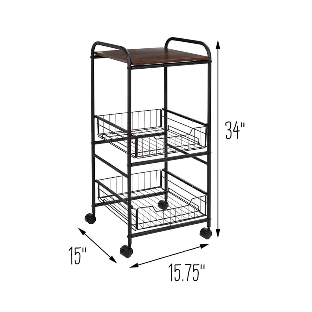 Slightly larger than a foot wide and deep, this sleek and narrow rolling cart is on a roll when it comes to organization! It easily slips into corners or unused space between furniture with its tiny footprintβadding 2 basket drawers and 1 shelf of versatile storage. The natural-toned MDF top shelf is always at the ready for displaying your favorite plant or keeping office supplies in reach, while the pull-out baskets keep your items corralled and secure. When wheeled into the kitchen, the drawers can organize everything from produce to tall containers. And in other parts of the home, it is equally as useful. Roll it into the craft room to organize art supplies, the home office to boost storage, or the bathroom to sort beauty products. No matter where you use it, this chic wood and metal cart offers a timeless feel that transcends trends and offers endless years of aesthetically pleasing organization.