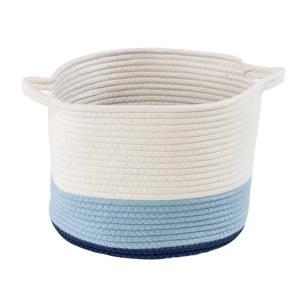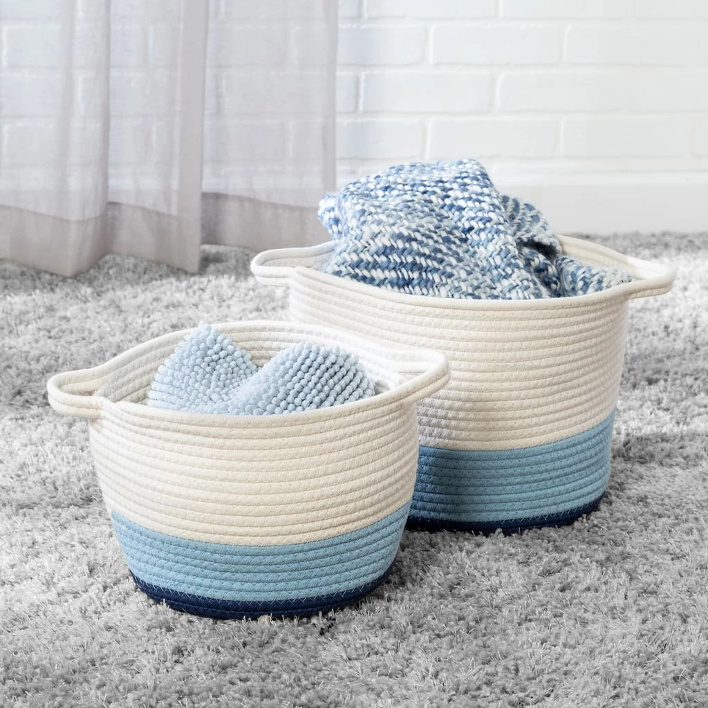 The sound of a tower of wooden blocks crashing to the ground? A quick solution to this problem is this set of nesting cotton rope storage baskets. Featuring a playful blue ombrΓ© effect, these baskets are stylish and functional.