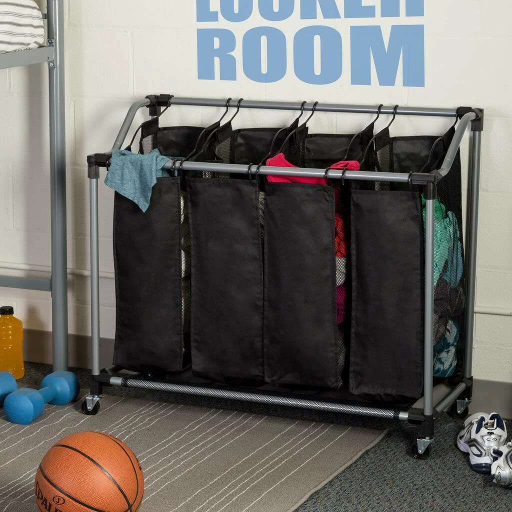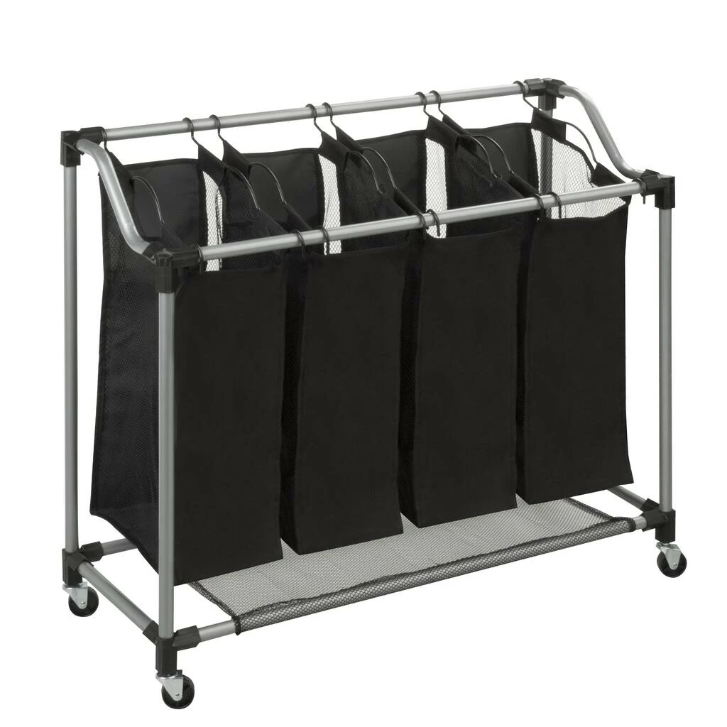You’ve got the fancy bar cart, the mid-century modern credenza; now you can shine up your laundry game too with this sleek Quad Laundry Sorter with black mesh bags. Glowing amid your dirty clothes like a beacon of style, this modern laundry hamper effortlessly glides from room to room while helping you separate your whites, darks and gold lamΓ© loungewear. The breathable black mesh bags keep you breathing a little more fabulously on chore day. Both functional and fancy, this 4 bag laundry sorter has enough moxie to wear designer clothes and separate all the ones that need washing.