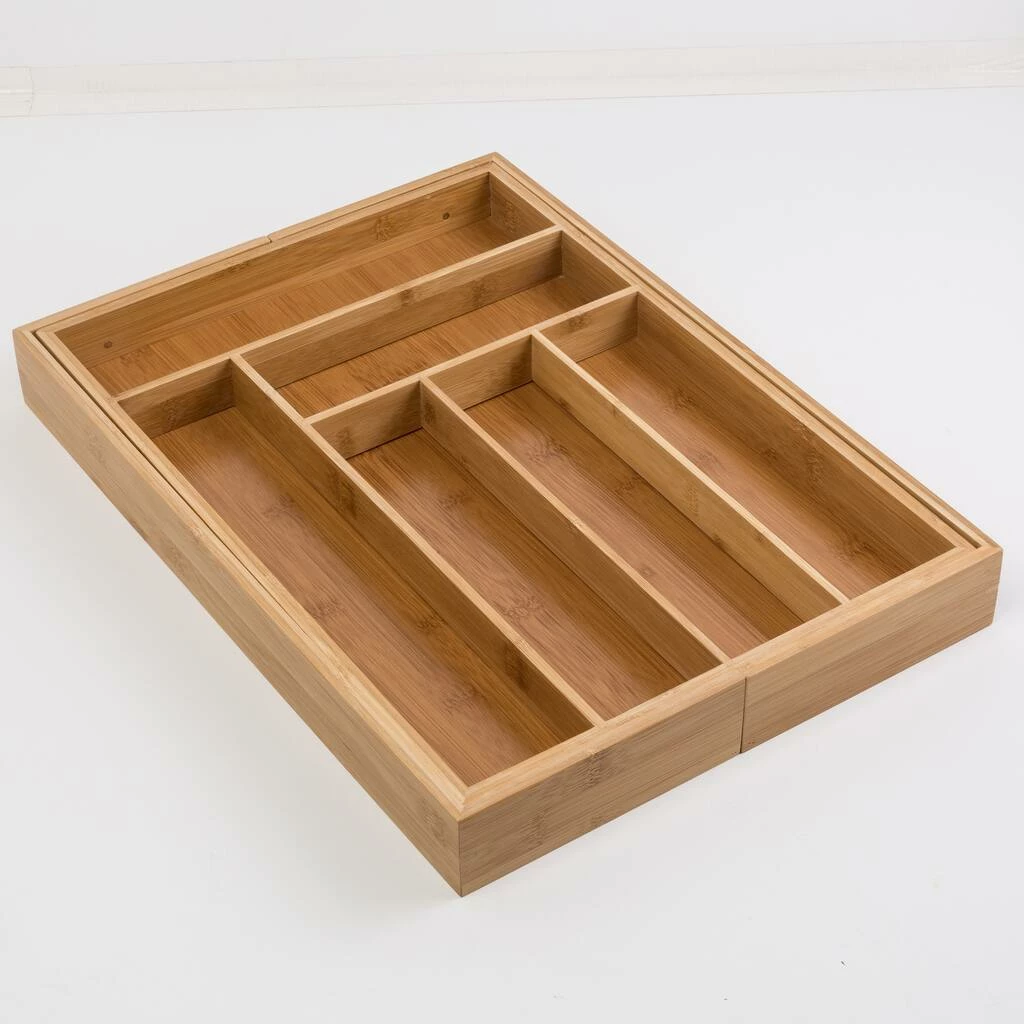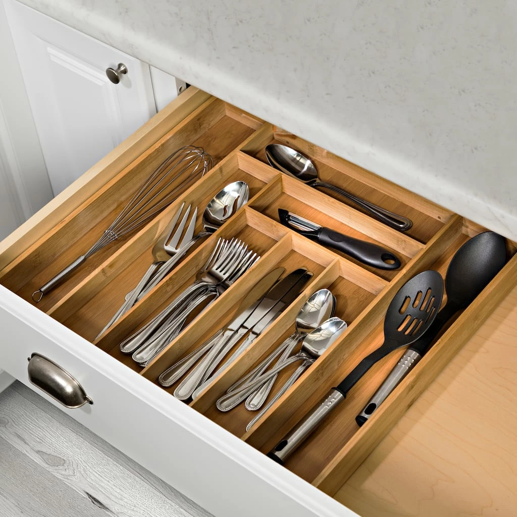 Customize to fit your drawer space with this expandable bamboo silverware drawer organizer meant for larger kitchen drawers. Conveniently pull it apart to fit into a larger drawer, and re-use it in your smaller home office drawer later by contracting it down to size. Easy-on-the-earth bamboo makes you feel even better about yourself when putting the clean silverware away.