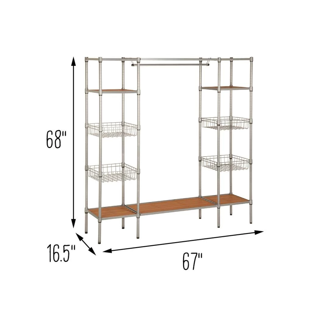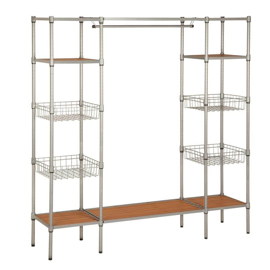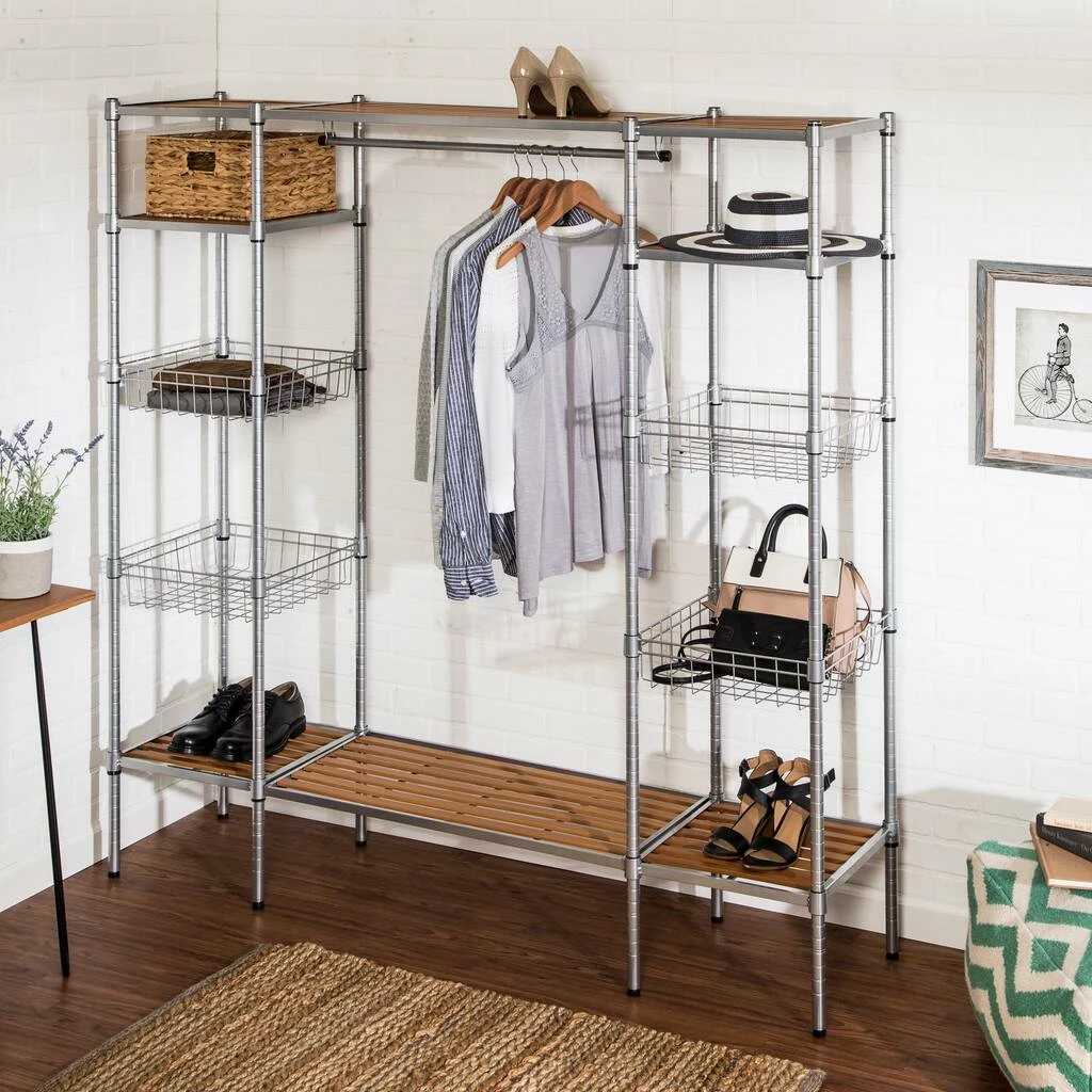 Drop that sledgehammer and move away from the drywall! With this freestanding open closet wardrobe, any wall can become a closet without needing a construction permit. The 34” garment rod hangs high enough for maxi dresses, suits, and your fuzziest onesies. Flanking the closet bar, four wire basket shelves and two flat shelves can hold your bags, hats, and other accessories. Two additional slatted shelves at the bottom and top run the length of the wardrobe. And the closet system stands high enough on the ground to fit shoes or slide bins underneath.