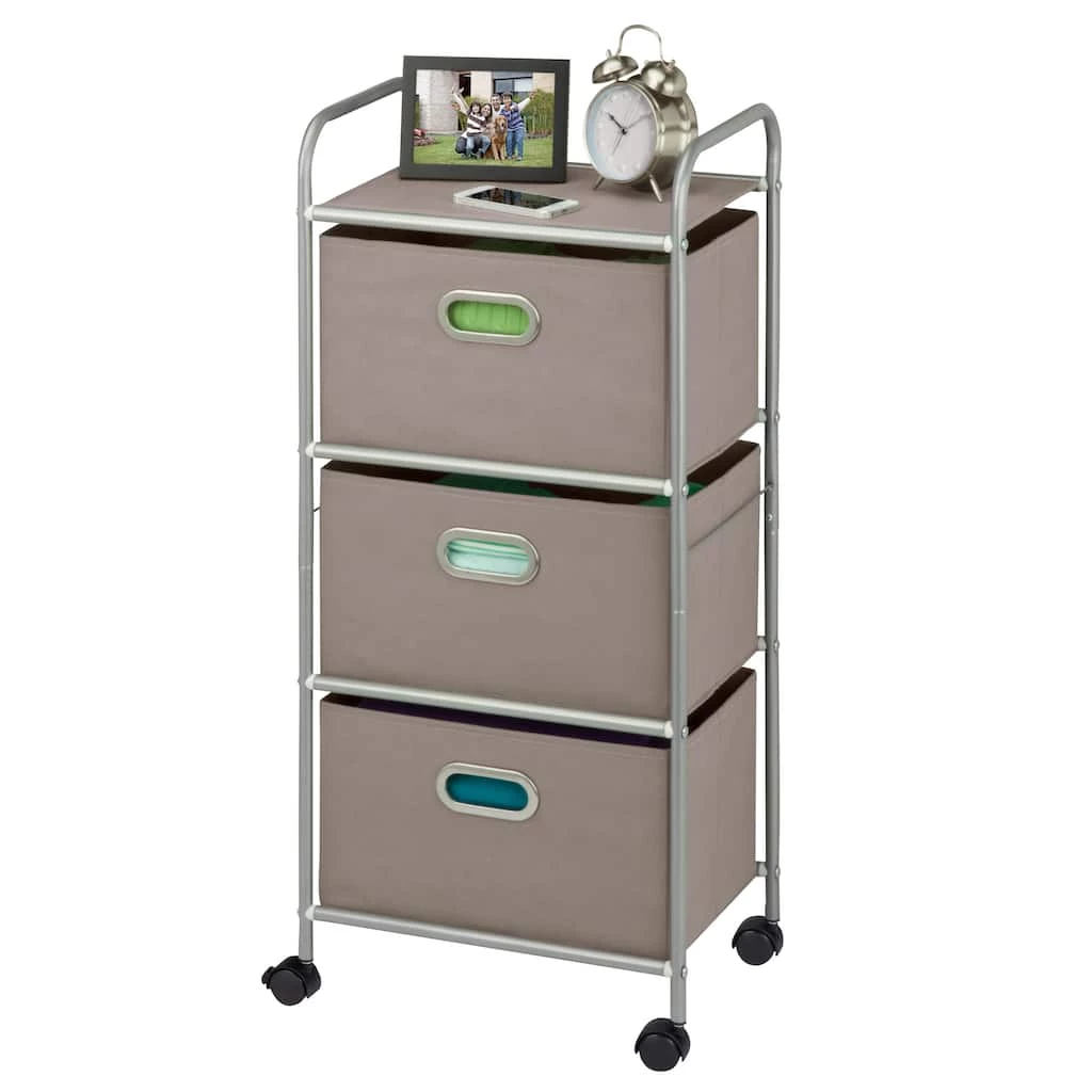 Getting organized has never looked better with this impressive fabric cart. The smooth rolling storage unit has three spacious drawers to hold clothes, tools, or anything else you need tucked away. A soft top surface provides even more storage space, and can double as a night-stand. Two locking wheels keep the cart securely in place as needed, and unlock for easy maneuvering around the room.