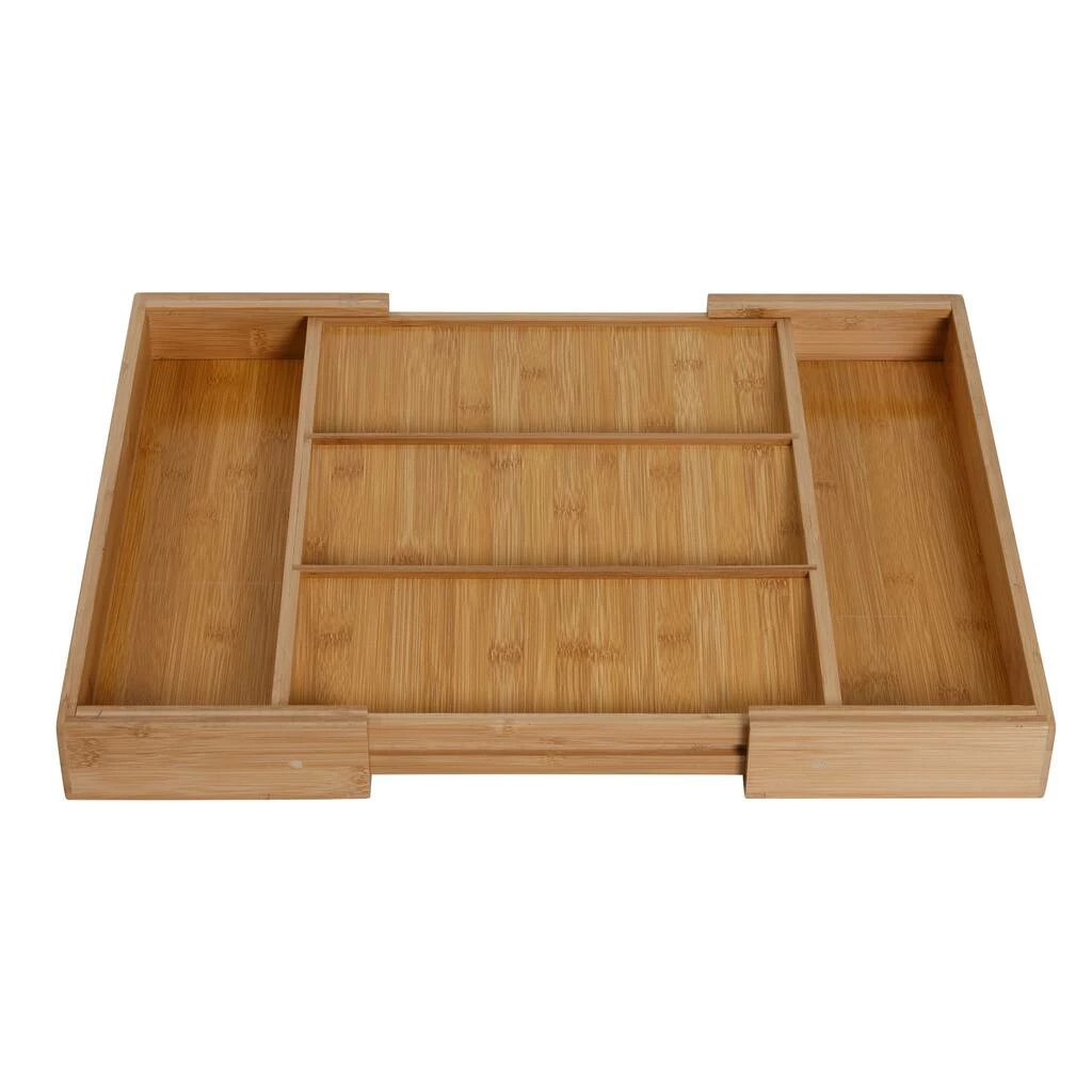 Every messy drawer deserves the long-lasting organization and timeless style that this bamboo drawer organizer offers! It features a slanted middle compartment to maximize drawer space and ensure items in the back are easy to see. To further your organization options and ensure the perfect fit, it also has two pull-out side trays. These double-duty side trays won’t just keep the organizer snug in the drawer, thoughβthey also offer extra-long compartments that are perfect for taller items like spatulas, ladles, whisks, pens, tinfoil, and baggies. The only thing that makes this drawer insert more sensational is the warm natural finish that is both durable and timeless. Whether you use this must-have as a silverware tray, spice organizer for a drawer, or a junk drawer savior, your kitchen organizationβand future youβwill thank you!