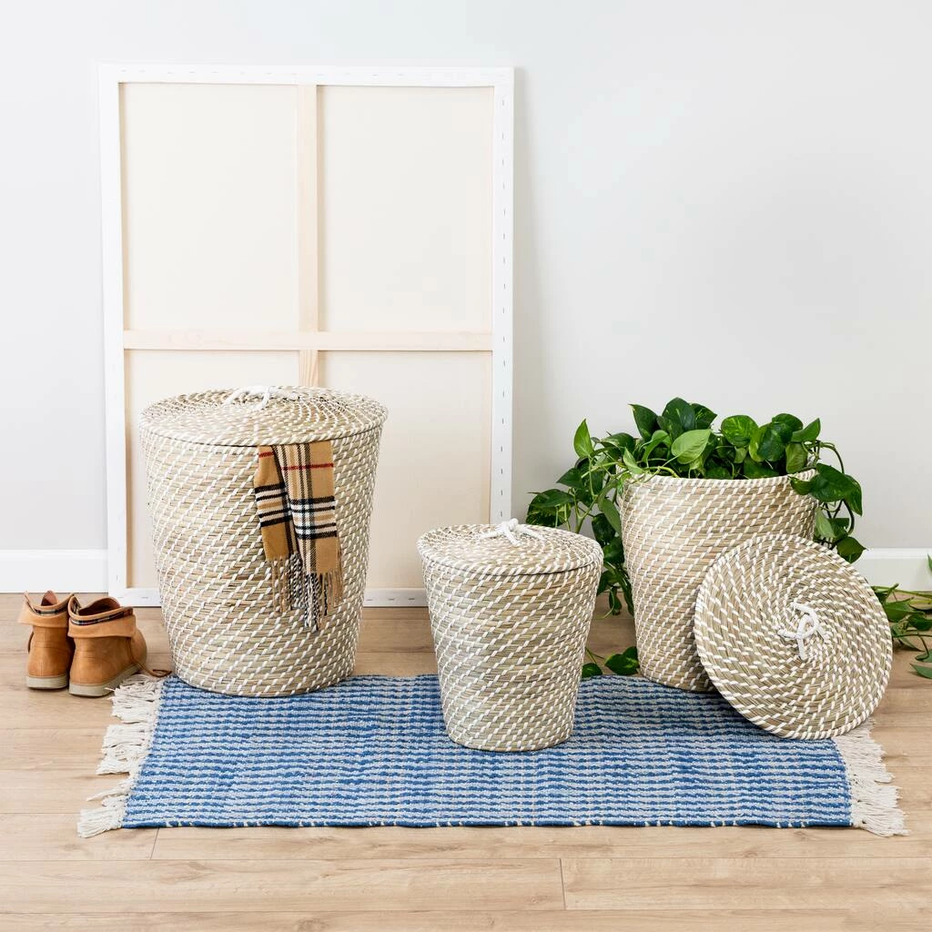 Keep your space, whichever space it is, tidy with these three different-size storage baskets that can hold anything from throw blankets to towels to toys. These nesting storage baskets are stackable when not in use, and the basket lids keep unwanted items out of sight. In addition to their undisputed functionality, the charming seagrass design brings a unique sophistication to any space.