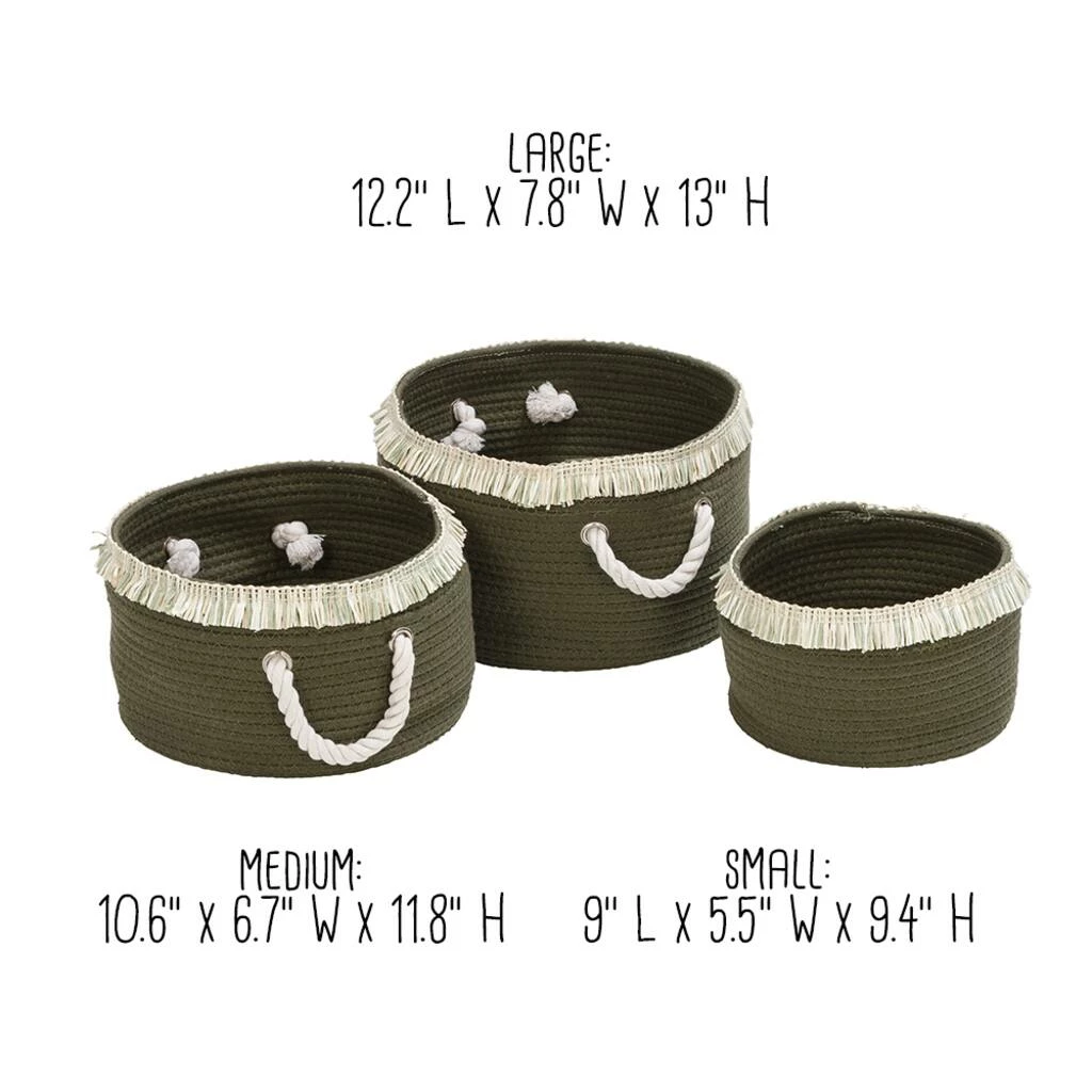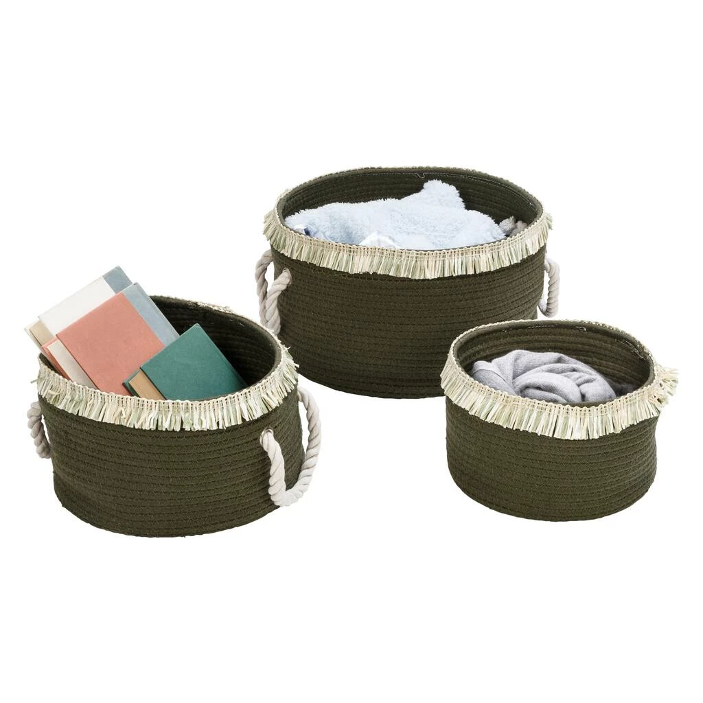 Elevate your dΓ©cor in an instant with a set of versatile cotton rope baskets that are as chic as they are handy. This set of 3 nesting baskets has an earthy aesthetic with its olive hue and chunky rope wrap contrasted by a flowing fringe. Their double handle design makes it simple to tote them around the house to do everything from picking up magazines to collecting the kids’ laundry.