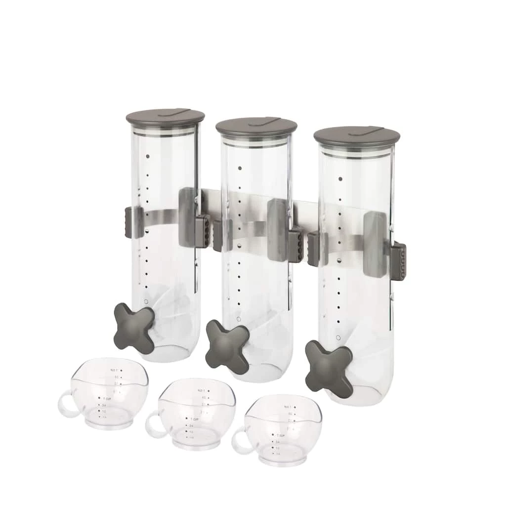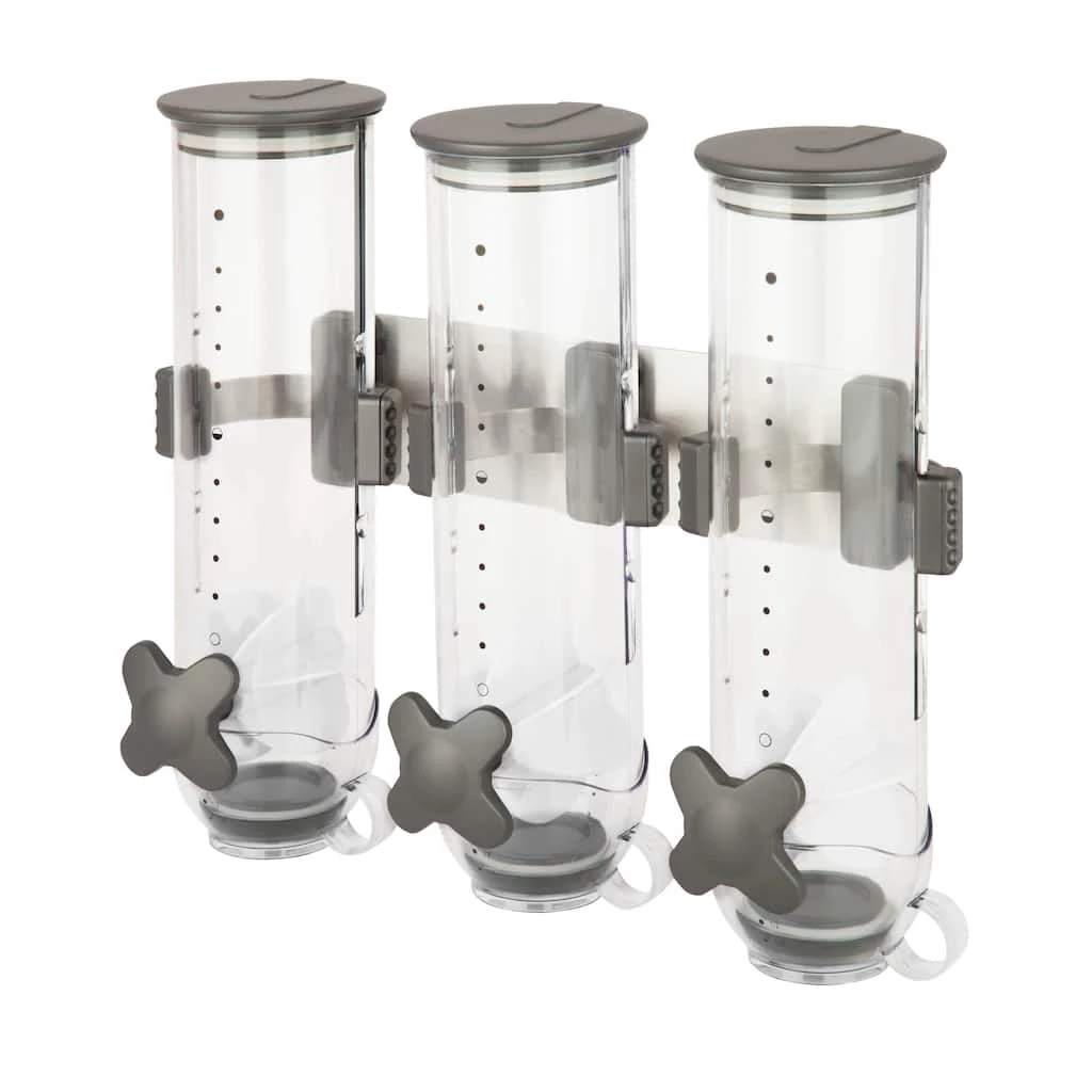 Suitable for dry foods such as cereal, oatmeal, candy, granola, nuts and more, this convenient storage and portion control solution dispenses approximately one ounce with each twist. Each canister holds 13 ounces of dry food. Designed to preserve freshness for up to 45 days, this unit is perfect for the health/weight-conscious and for controlling stacking. Includes screws and mounting guide. Can also be mounted with heavy-duty double-sided foam tape.