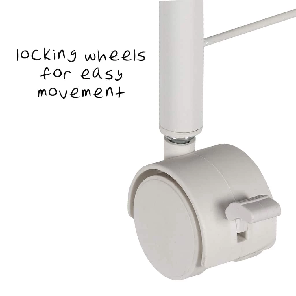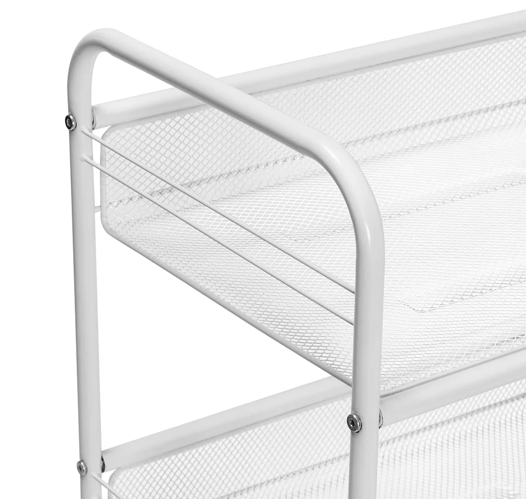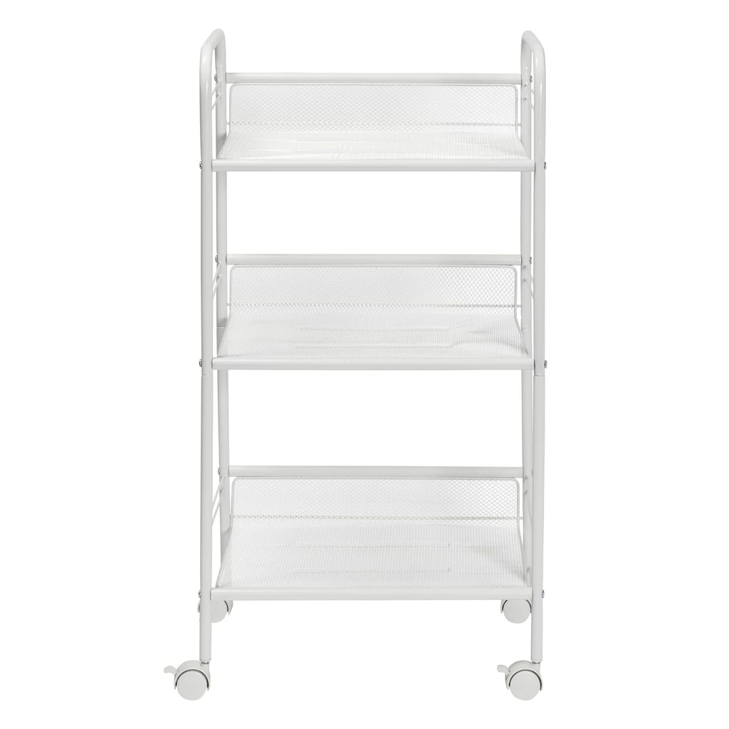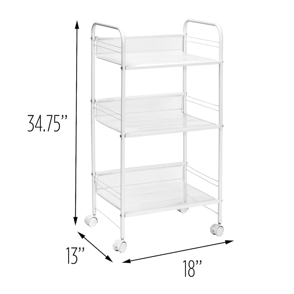 Easy to transport with plenty of storage space, this white 3-shelf steel rolling storage cart will allow you to transfer your items from room to room with ease. Features four casters for smooth mobility, with two that lock to secure the cart in place when necessary. It’s the perfect storage companion for any room in the home.