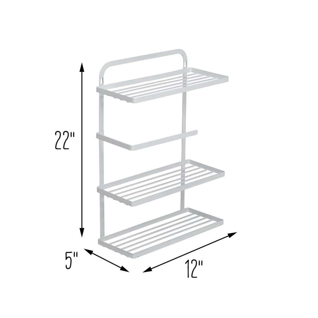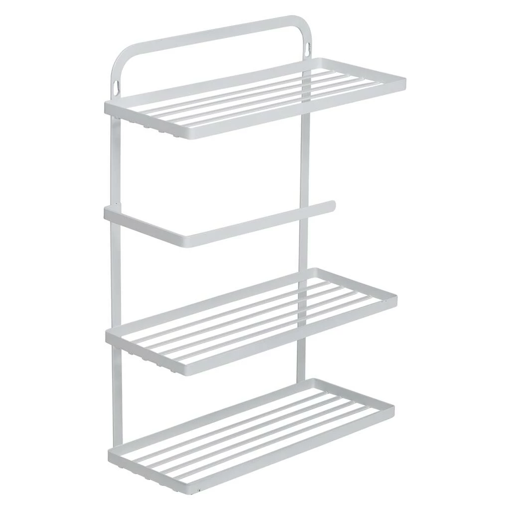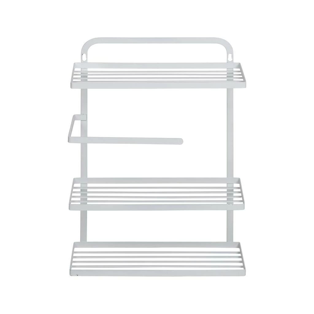 This steel spice rack with a paper towel holder has everything you need to organize small cooking essentials while keeping your kitchen stylish. Simply use the included over-the-door hooks to secure this metal kitchen organizer to any cabinet door–inside or out. Or use the mounting hardware to create a small kitchen wall shelf. From there, dress it up in all your favorite kitchen essentials and accessories! While the middle rod is perfect for holding paper towel rolls, it is also wonderful for hanging a dishcloth or two. Plus, the multiple tiers of shelves are also multipurpose. While they make great spice racks or tea organizers, they also look lovely styled with small plants, salt and pepper shakers, or other kitchen accessories. Either way, the slated design collects less dust than solid kitchen shelves. So even though your paper towels will always be easy to access, you can spend less time cleaning.